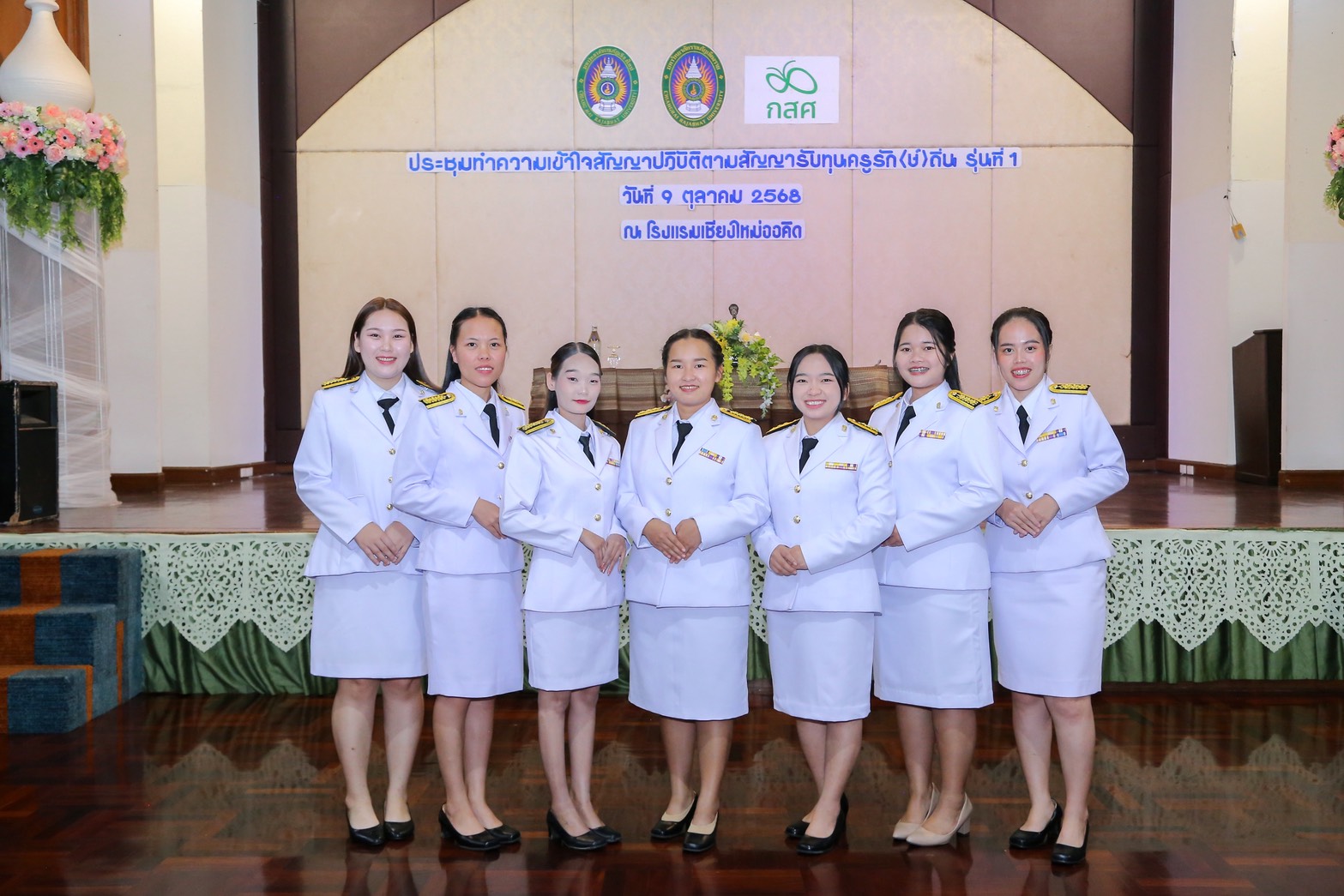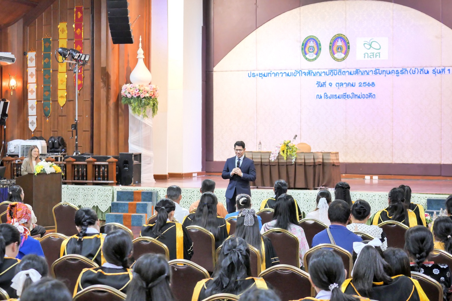 ????วันที่ 9 ตุลาคม 2568 กองทุนเพื่อความเสมอภาคทางการศึกษา (กสศ.) จัดการประชุมทำความเข้าใจสัญญาการปฏิบัติงานสำหรับบัณฑิตทุน “ครูรัก(ษ์)ถิ่น รุ่นที่ 1” เพื่อเตรียมความพร้อมก่อนการเข้าปฏิบัติหน้าที่ในพื้นที่บริการการศึกษา คณะครุศาสตร์ มหาวิทยาลัยราชภัฏเชียงราย นำโดย ผู้ช่วยศาสตราจารย์ ดร.ศิวภรณ์ สองแสน ผู้ช่วยอธิการบดี มหาวิทยาลัยราชภัฏเชียงราย พร้อมด้วย อาจารย์กนกวรรณ วังมณี และอาจารย์อภิพร เป็งปิง อาจารย์ประจำแขนงวิชาการศึกษาปฐมวัย คณะครุศาสตร์ เข้าร่วมเป็นผู้แทนของมหาวิทยาลัย เพื่อร่วมแสดงความยินดีกับบัณฑิตครูรัก(ษ์)ถิ่น รุ่นที่ 1 จากมหาวิทยาลัยราชภัฏเชียงราย และมหาวิทยาลัยราชภัฏเชียงใหม่ ภายในงาน ผู้แทนจากมหาวิทยาลัยราชภัฏเชียงรายได้ร่วมกล่าวแสดงความยินดี พร้อมรับฟังการชี้แจงแนวทางการปฏิบัติงานตามสัญญารับทุน เพื่อสร้างความเข้าใจที่ถูกต้องและส่งเสริมให้บัณฑิตมีความพร้อมในการกลับไปพัฒนาการศึกษาในภูมิลำเนาของตนอย่างเต็มศักยภาพ
