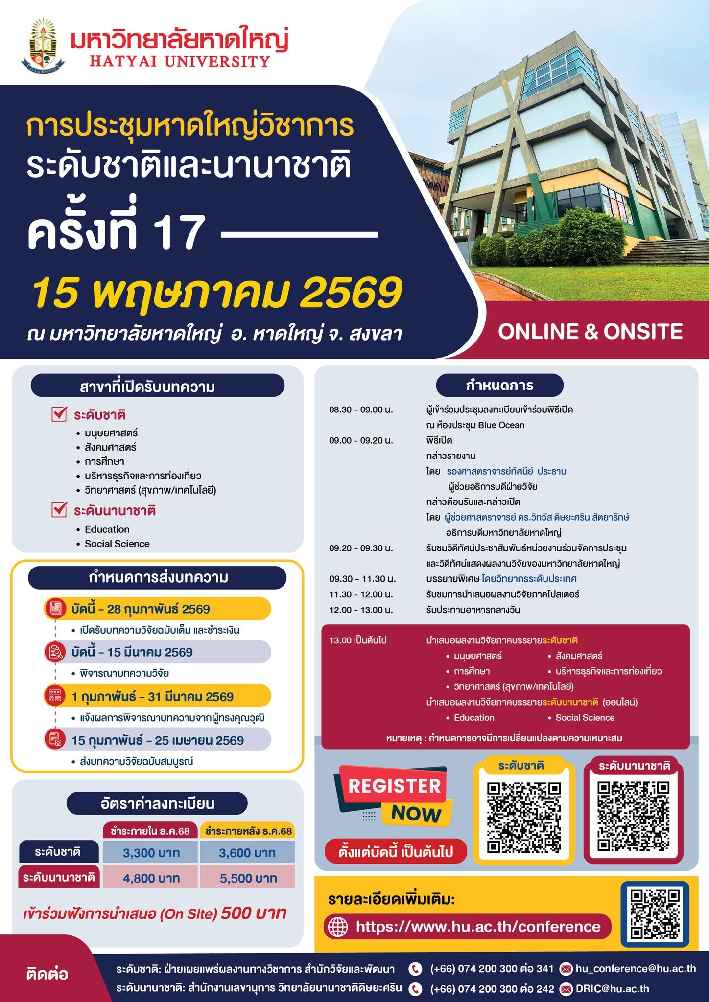 มหาวิทยาลัยหาดใหญ่ขอเชิญเข้าร่วมประชุมและนำเสนอผลงานวิจัยในการประชุมหาดใหญ่วิชาการระดับชาติและนานาชาติ ครั้งที่ 17 เปิดรับบทความตั้งแต่บัดนี้ - 28 กุมภาพันธ์ 2569