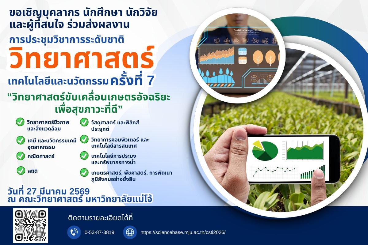มหาวิทยาลัยแม่โจ้ ขอเชิญชวนผู้สนใจร่วมส่งผลงานวิชาการในการประชุมวิชาการระดับชาติ "วิทยาศาสตร์ เทคโนโลยี และนวัตกรรม ครั้งที่ 7" ภายใต้หัวข้อ “วิทยาศาสตร์ขับเคลื่อนเกษตรอัจฉริยะเพื่อสุขภาวะที่ดี”