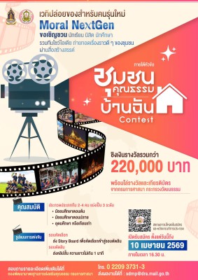 ประกาศตามหาทีมผลิตสื่อรุ่นใหม่ บนเวที Moral NextGen! ภายใต้หัวข้อ “ชุมชนคุณธรรมบ้านฉัน” ประจำปี 2569 ไม่ว่าจะเป็น วัฒนธรรม น้ำใจ หรือวิถีชีวิตที่งดงาม เปลี่ยนเรื่องเล่าให้เป็นภาพเคลื่อนไหวในมุมมองของคุณ ชิงเงินรางวัลรวมกว่า 220,000 บาท พร้อมโล่รางวัลและเกียรติบัตรจากกรมการศาสนา กระทรวงวัฒนธรรม