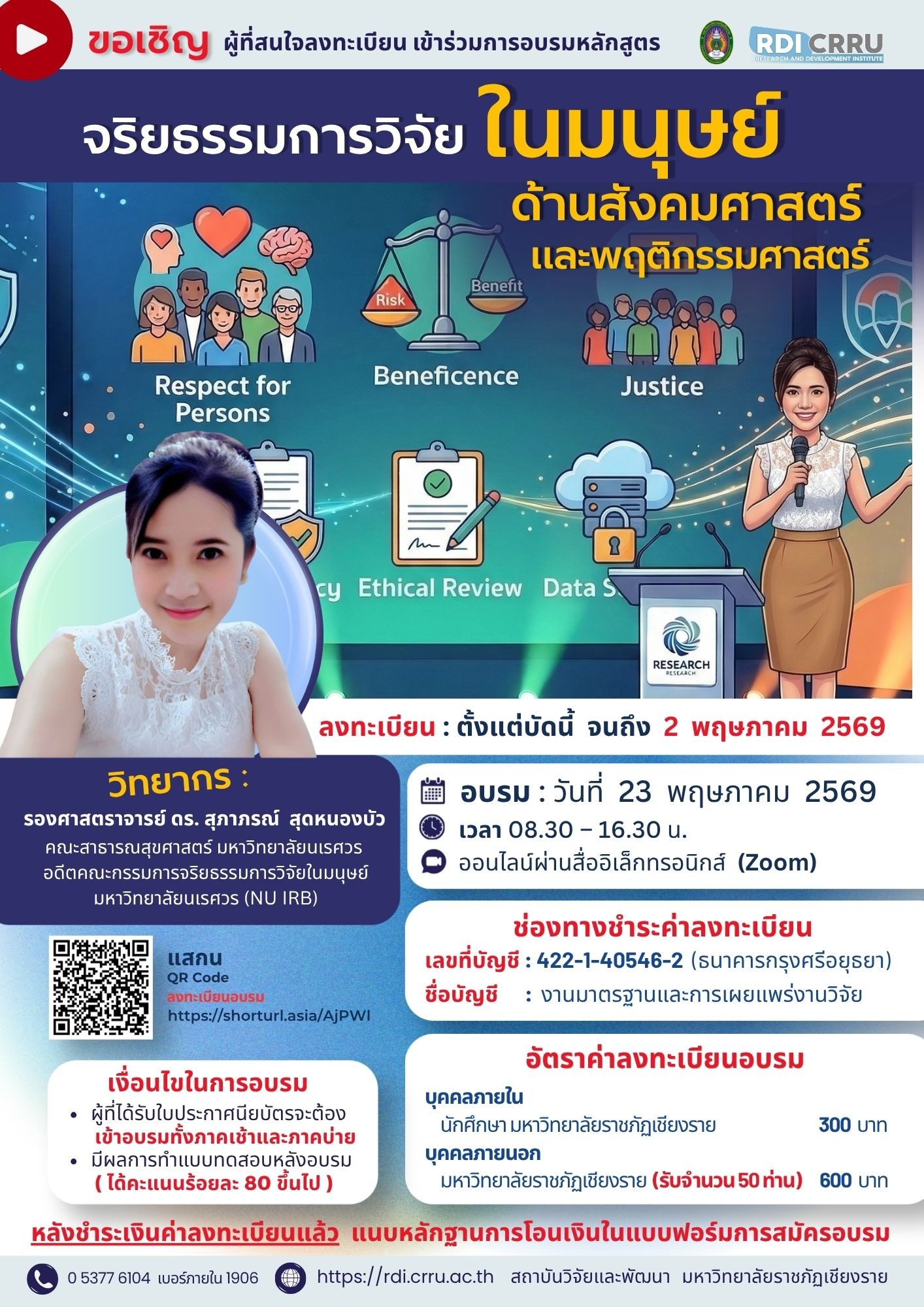 ขอเชิญผู้ที่สนใจเข้าร่วม โครงการอบรม “จริยธรรมการวิจัยในมนุษย์ด้านสังคมศาสตร์และพฤติกรรมศาสตร์" (สำหรับนักวิจัย) รูปแบบออนไลน์ (ZOOM)